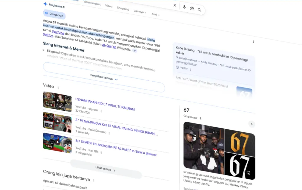 Tren angka “67” sendiri bukanlah fenomena yang muncul tiba-tiba. Angka ini telah menjadi bagian dari percakapan budaya daring yang lebih luas tahun ini, seringkali diasosiasikan dengan tren “6-7” yang populer di video pendek dan meme. Meskipun tidak memiliki arti formal, angka ini telah diadopsi sebagai bagian dari percakapan daring, yang kemudian dipilih oleh Google sebagai “kode pencarian” untuk Easter egg terbarunya.