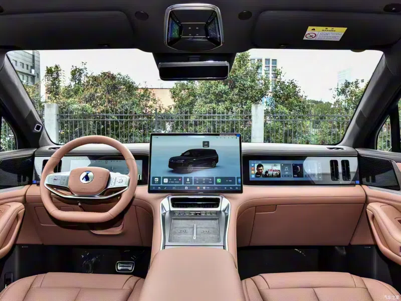 Masuk ke interior, Denza N8L langsung menonjolkan pendekatan kabin digital melalui kehadiran beragam layar berukuran besar yang tersebar di seluruh area kokpit dan baris belakang.