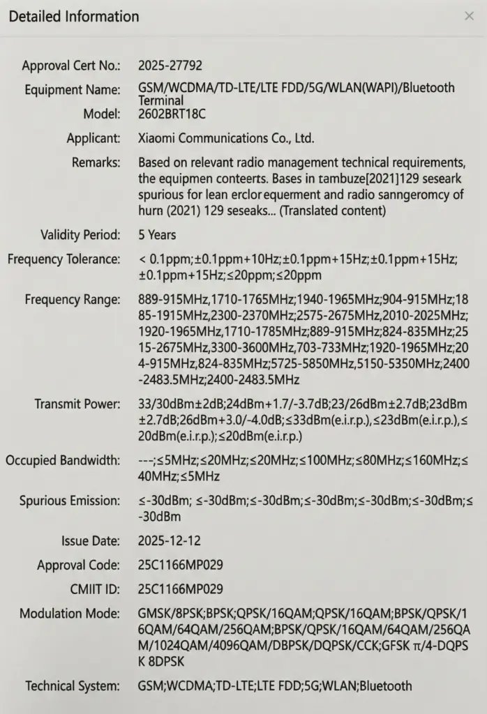 Sebuah perangkat Xiaomi terbaru dengan nomor model 2602BRT18C telah mengantongi sertifikasi radio SRRC di Tiongkok, menandakan peluncurannya semakin dekat.